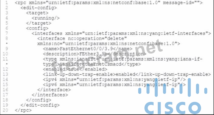 The exhibit shows an XML configuration using NETCONF (Network Configuration Protocol) to edit the configuration of a network device. Specifically, the <edit-config> operation is being used with the nc:operation="delete" attribute within the <interface> element. This means that the configuration is intended to delete specific configurations related to the interface named FastEthernet0/0/3.9.