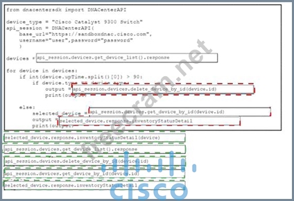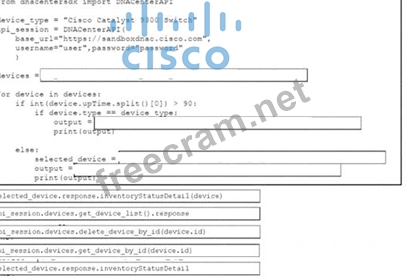 A Python script must delete all Cisco Catayst 9300 Series switches that have an uptime that is greater than 90 days The script must also query for the status of all the other devices Drag and drop the code from the bottom onto the bottom box the code is missing to complete the script Not at options are used