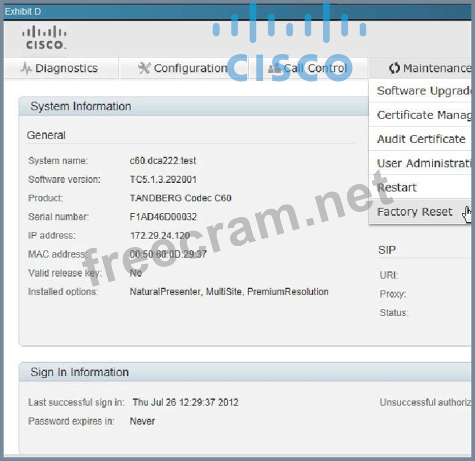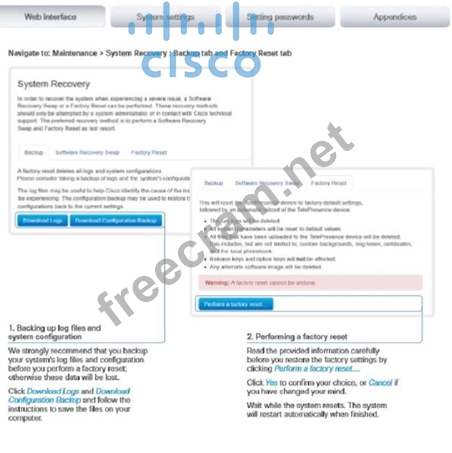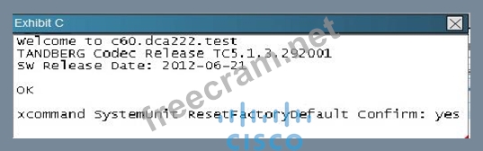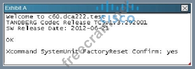 Reference: http://www.cisco.com/c/dam/en/us/td/docs/telepresence/endpoint/profile-series/tc7/ administration-guide/profile-c60-c40-and-codec-c60-c40-administrator-guide-tc70.pdf Exp: System recovery: Factory reset If there is a severe problem with the video system, the last resort may be to reset it to its default factory settings. Always consider reverting to the previously used software image before performing a factory reset. In many situations this will recover the system*.