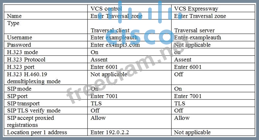 http://www.cisco.com/c/dam/en/us/td/docs/telepresence/infrastructure/vcs/config_guide/X8-2/Cisco-VCS- IP-Port-Usage-for-Firewall-Traversal-Deployment-Guide-X8-2.pdf Exp: Task 9: Configuring the Traversal Zone The traversal zone configuration defines a connection between the VCS Control and VCS Expressway platforms.