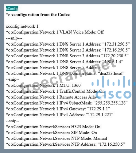 Explanation/Reference: Explanation: The subnet mask configured on the codec is 255.255.255.128, when it should be 255.255.255.0.