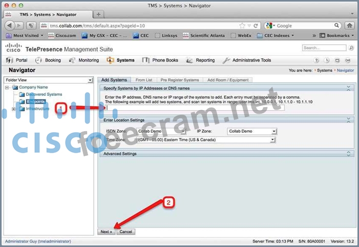 a. On your lab laptop open a web browser and navigate to your Telepresence Management Suite (TMS) instance at: http://tms.collab.com/tms b. Login as