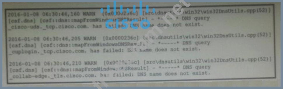 Refer to the exhibit. When a user cannot log into the Cisco Jabber client, the log file from a Windows Jabber client on an internal network is shown. Which SRV must the DNS administrator create to resolve the problem?