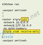 Notice that R3 is configured as a stub receive-only router. The receive-only keyword will restrict the router from sharing any of its routes with any other router in that EIGRP autonomous system. This keyword will also prevent any type of route from being sent.