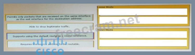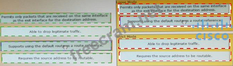 Drag and drop each statement about uRPF on the left to the correct uRPF mode on the right.