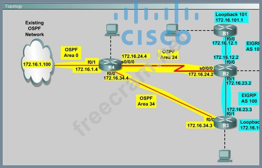 The network requirements state that you must be able to ping and telnet from loopback 101 on R1 to the OPSF domain test address of 172.16.1.100. All traffic must use the shortest path that provides the greatest bandwidth. The redundant paths from the OSPF network to the EIGRP network must be available in case of a link failure. No static or default routing is allowed in either network.