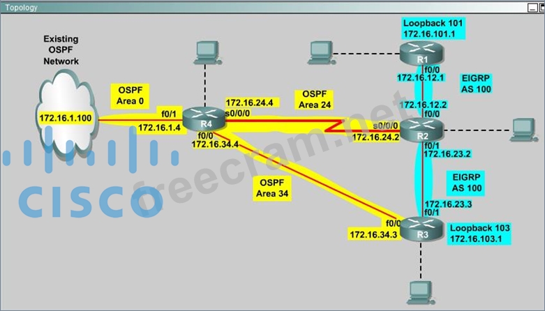 The network requirements state that you must be able to ping and telnet from loopback 101 on R1 to the OPSF domain test address of 172.16.1.100. All traffic must use the shortest path that provides the greatest bandwidth. The redundant paths from the OSPF network to the EIGRP network must be available in case of a link failure. No static or default routing is allowed in either network.