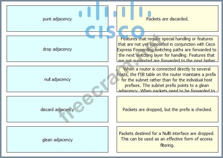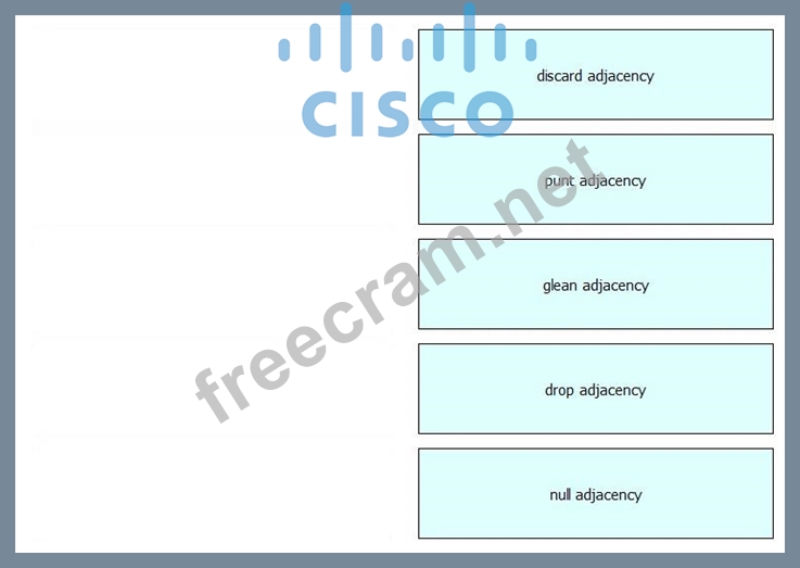 Drag and drop the Cisco Express Forwarding adjacency types from the left to the correct type of processing on the right.