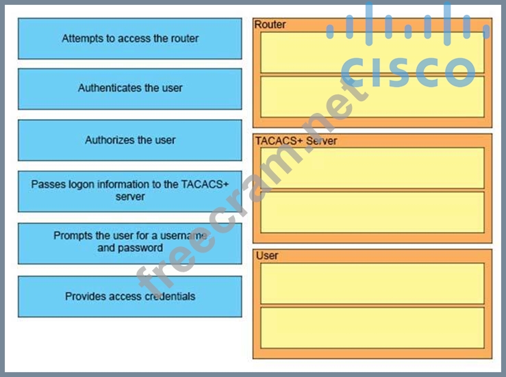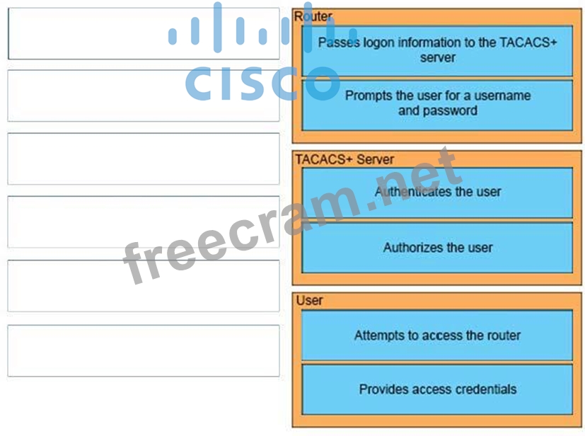 Drag and drop the steps in the TACACS+ authentication process from the left onto the actors that perform them on the right.
