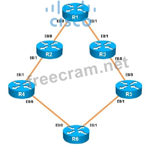 Traffic from R1 to R6's Loopback address is load shared between R1-R2-R4-R6 and R1-R3-R5-R6 paths.