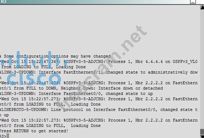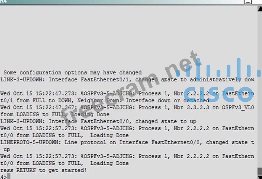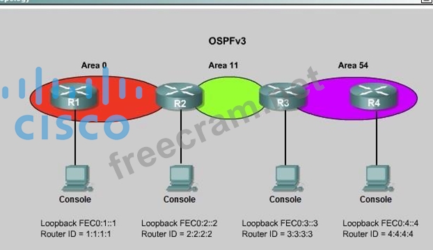Currently OSPF is configured on all routers. However, R4's loopback address (FEC0:4:4) cannot be seen in R1's Ipv6 routing table. You are tasked with identifying the cause of this fault and implementing the needed corrective actions that uses OPSF features and does not change the current area assignments.