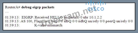 A network administrator is troubleshooting an EIGRP connection between RouterA, IP address 10.1.2.1, and RouterB, IP address 10.1.2.2.