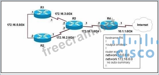EIGRP has been configured on all routers in the network. What additional configuration statement should be included on router R4 to advertise a default route to its neighbors?