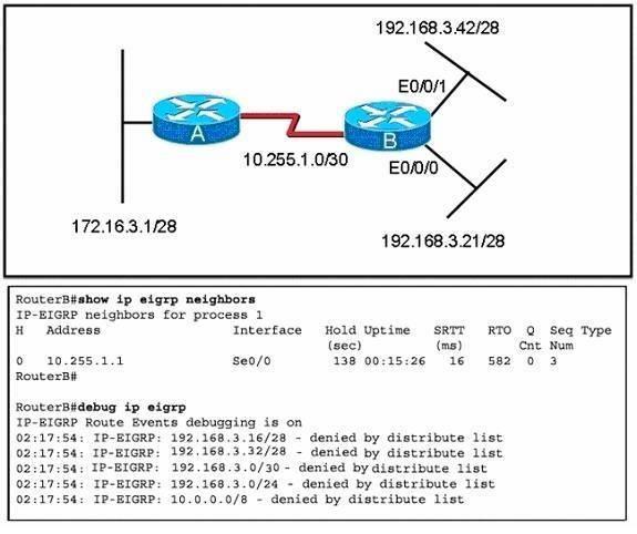 Refer to the exhibits. Router B should advertise the network connected to the E0/0/0 interface to router A and block all other network advertisements. The IP routing table on router A indicates that it is not receiving this prefix from router B.