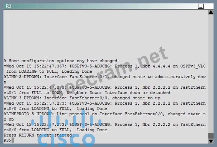 Currently OSPF is configured on all routers. However, R4's loopback address (FEC0:4:4) cannot be seen in R1's IPv6 routing table. You are tasked with identifying the cause of this fault and implementing the needed corrective actions that uses OPSF features and does not change the current area assignments.