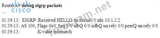 A network administrator is troubleshooting an EIGRP connection between RouterA, IP address 10.1.2.1, and RouterB, IP address 10.1.2.2.