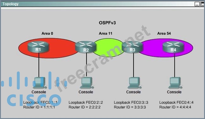 Currently OSPF is configured on all routers. However, R4's loopback address (FEC0:4:4) cannot be seen in R1's IPv6 routing table. You are tasked with identifying the cause of this fault and implementing the needed corrective actions that uses OPSF features and does not change the current area assignments.