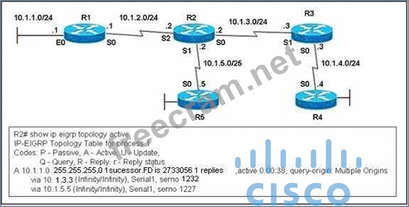 Explanation/Reference: Explanation When the link between R1 and R2 is down, R2 loses its successor for the network 10.1.1.0/24. R2 checks its topology table for a feasible successor but it can`t find one. So R2 goes active on the that route to find a new successor by sending queries out to its neighbors (R3 and R5) requesting a path to the lost route. Both R3 and R5 also go active for the that route. But R5 doesn`t have any neighbor to ask besides R2 so it will send an unreachable message to indicate it has no alternative path for that route and has no other neighbor to query. R3 also checks its EIRGP topology table for a feasible successor but it has none, too. Unlike R5, R3 has a neighbor (R4) so it continues to query this router. Now suppose there is a problem on the link between R3 and R4 so R4 never receives the query from R3 and of course, R3 also never receives a reply back from R4. Therefore, R3 can`t reply back to R2. After about 3 minutes, the Stuck in active (SIA) timer on R2 expires and R2 marks the route 10.1.1.0/24 as stuck in active route. The output line via 10.1.3.3 (Infinity/Infinity), r, Seiral0, serno 1232 indicates R2 has sent a query to 10.1.3.3 and is waiting for a reply (the lowercase r). (Reference: http://www.cisco.com/en/US/tech/tk365/technologies_tech_note09186a008010f016.shtml)