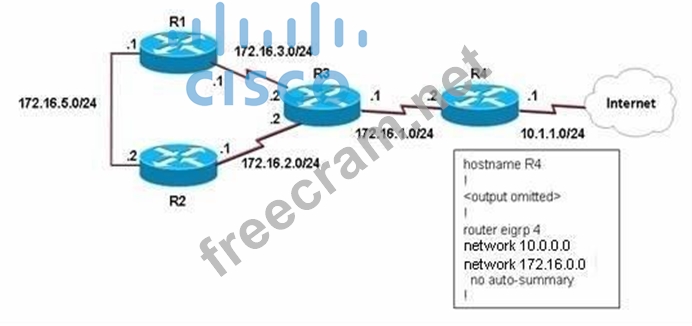 EIGRP has been configured on all routers in the network. What additional configuration statement should be included on router R4 to advertise a default route to its neighbors?