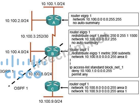 Router B is performing bidirectional redistribution between EIGRP and OSPF. The network 10.100.1.0/24 should not be reachable from the 10.100.9.0/24 network. However, it needs to be reachable from any network within the EIGRP domain. All other networks should be seen in both domains. Which change to router B would accomplish these goals?