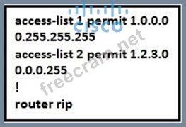Explanation/Reference: Explanation: Access list 2 is more specific, allowing only 1.2.3.0/24, whereas access list 1 permits all 1.0.0.0/8 networks. This question also asks us to apply this distribute list only to the outbound direction of the fast Ethernet 0/0 interface, so the correct command is distribute list 2 out FastEthernet0/0.