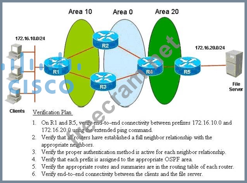 Refer to the exhibit. ROUTE.com is planning to implement a secure OSPF network to support traffic between clients on the 172.16.10.0/24 network and the file server on the 172.16.20./24 network. You have been asked to review the implementation and verification plans for this OSPF project. Which statement about the plan is true?