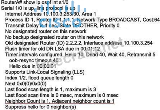 Question 225: RouterA# ~~~~~ ! router ospf 1 log-adjacency-changes network...