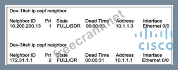 Question 196: The Dev-1 and Dev-3 routers are OSPF neighbors over the Ethe...