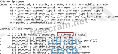 Next we will configure router R3 so that it has only 2 subnets of 10.0.0.0 network. Use the show ip route command on R3 to view its routing table:
