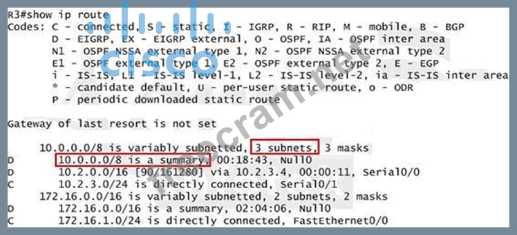 There is one interesting thing about the output of the show ip route shown above: the 10.2.3.0/24, which is a directly connected network of R3. We can't get rid of it in the routing table no matter what technique we use to summary the networks. Therefore, to make the routing table of R3 has only 2 subnets we have to summary other subnets into one subnet.