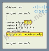 R3# configure terminal R3(config)# router eigrp 123 R3(config-router)# no eigrp stub receive-only R3 (config-router)# eigrp stub R3(config-router)# end Now R3 will send updates containing its connected and summary routes to other routers. Notice that the eigrp stub command equals to the eigrp stub connected summary because the connected and summary options are enabled by default.