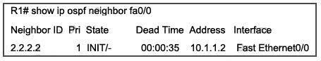 You have just completed an OSPF implementation. While executing your verification plan, you determine that R1 is not able to establish full OSPF adjacency with R2. The show ip ospf neighbor command output on R1 shows that R2 is stuck in the INIT state.