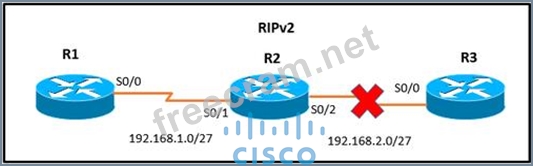 Refer to the exhibit. The network setup is running the RIP routing protocol. Which two events will occur following link failure between R2 and R3? (Choose two.)