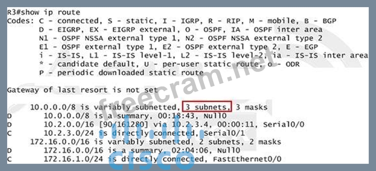 Next we will configure router R3 so that it has only 2 subnets of 10.0.0.0 network. Use the show ip route command on R3 to view its routing table: