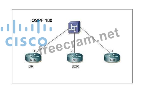 During a recent OSPF election among three routers, RTA was elected the DR and RTB was elected the BDR, as seen in the graphic. Assume that RTA fails, and that RTB takes the place of the DR while RTC becomes the new BDR. What will happen when RTA comes back online?