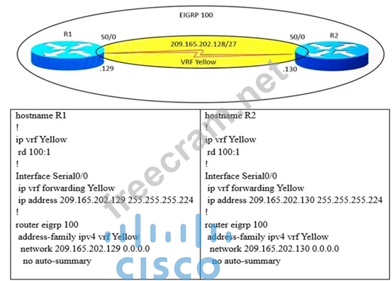 Refer to exhibit. A network engineer is unable to make VRF lite EIGRP adjacency work. There is nothing wrong with communication between R1 and R2. What command will eliminate the issue when executed on both routers?