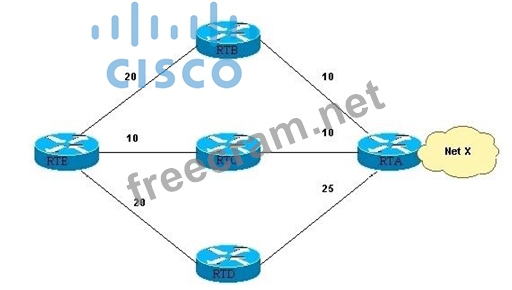 Explanation/Reference: Explanation: Advertised distance of RTD is greater than FD of RTE-RTC-RTA, so the route through D will not be used. Please notice that routes must first satisfy the feasible condition to be considered for "variance" command: The feasible condition states: "To qualify as a feasible successor, a router must have an AD less than the FD of the current successor route". In this case, the current successor route is E -> C -> A and the FD of this successor route is 20. But the AD of route E-D-A is 25 which is bigger than the FD of the successor route -> It will not be put into the routing table even if the "variance 3" command is used.