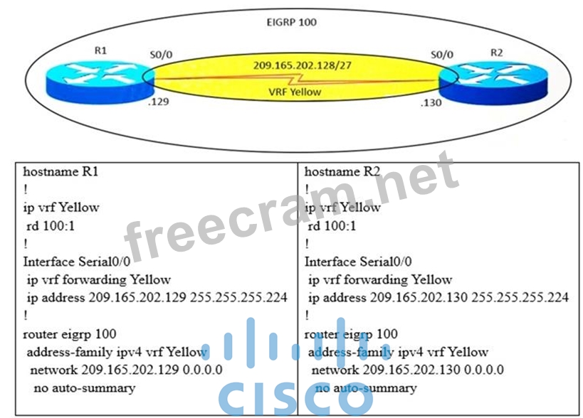 Refer to exhibit. A network engineer is unable to make VRF lite EIGRP adjacency work. There is nothing wrong with communication between R1 and R2. What command will eliminate the issue when executed on both routers?