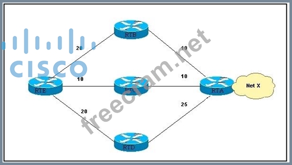 If the command variance 3 were added to RTE, which path or paths would be chosen to route traffic to network X?
