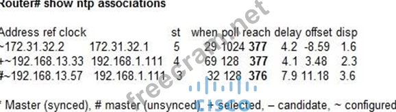 376 = 1 1 1 1 1 1 1 0 Time 1: Last NTP response was NOT received (lost in network) Values below this 376 is that Last NTP response was received A pound sign (#) displayed next to a configured peer in the show ntp associations command output indicates that the router isn't syncing with the peer but NTP request and response packets are NOT exchanged.