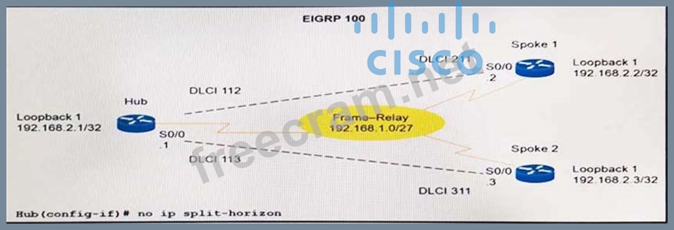 Refer to the exhibit. A network engineer is working on the network topology and executes the command no ip split-horizon on interface SO/0 of the hub router. What is the result of this command?