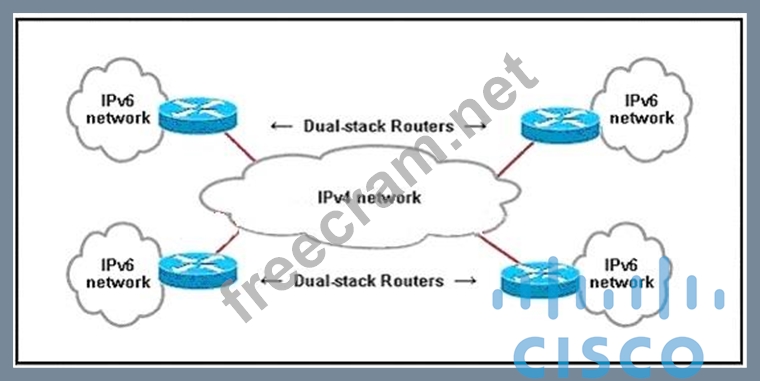 Refer to the exhibit. Which interoperability technique implemented on the dual-stack routers would allow connectivity between IPv6 sites across automatic created tunnels using the 2002::/16 prefix?