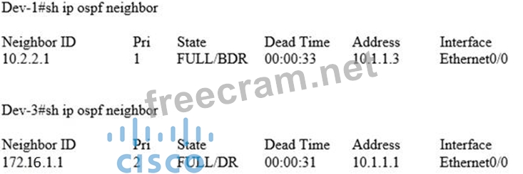 The Dev-1 and Dev-3 routers are OSPF neighbors over the Ethernet 0/0 connection. Based on the show ip ospf neighbor output from the Dev-1 and Dev-3 routers, which statement is true? Select the best response.