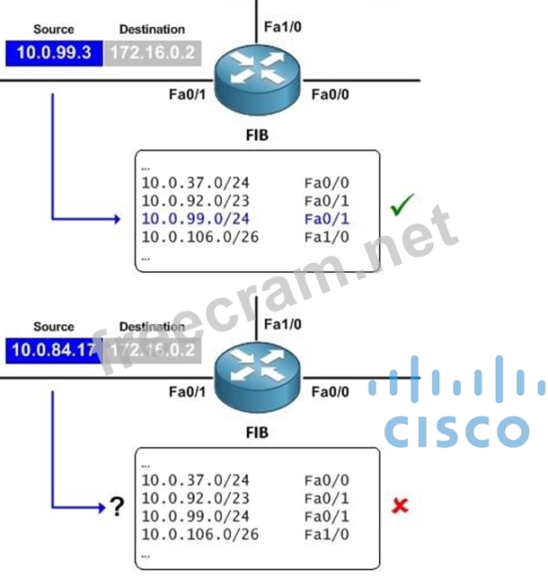 2827 (BCP 38/RFC 2827) anti-spoofing filtering on the customer-to- ISP network edge. By taking advantage of the information stored in the Forwarding Information Base (FIB) that is created by the Unicast RPF can determine whether IP packets are spoofed or malformed by CEF switching process matching the IP source address and ingress interface against the FIB entry that reaches back to this source (a so-called reverse lookup). Packets that are received from one of the best reverse path routes back out of the same interface are forwarded as normal. If there is no reverse path route on the same interface from which the packet was received, it might mean that the source address was modified, and the packet is dropped (by default).
