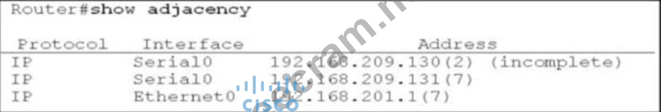 A network administrator checks this adjacency table on a router. What is a possible cause for the incomplete marking?