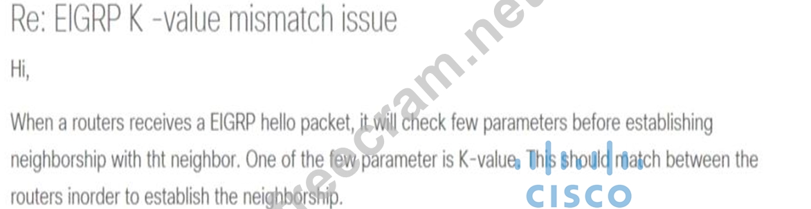 Question 83: What happens when two EIGRP peers have mismatched K values?...