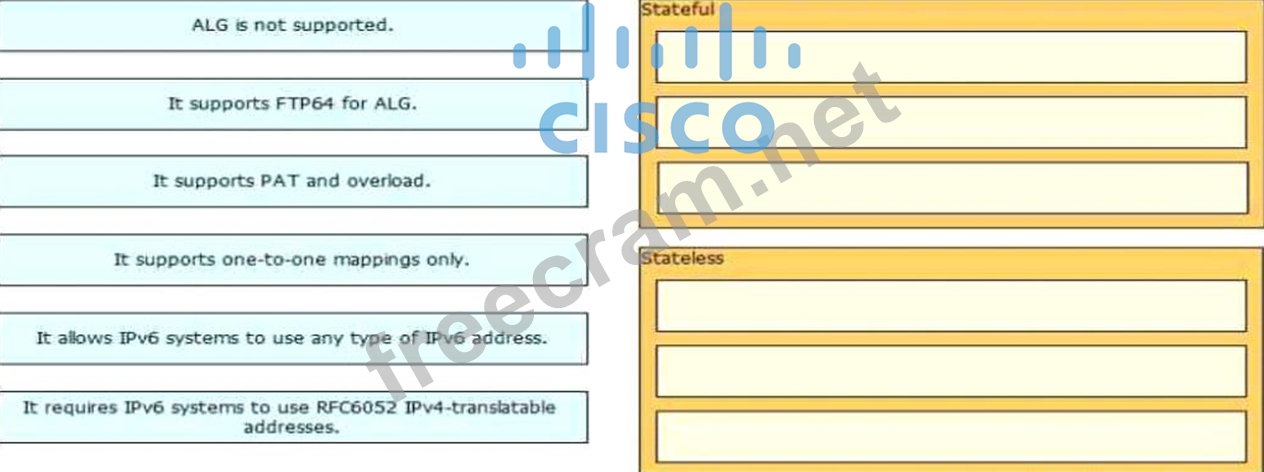 Drag and drop the statements about NAT64 from the left onto the correct NAT64 types on the right.
