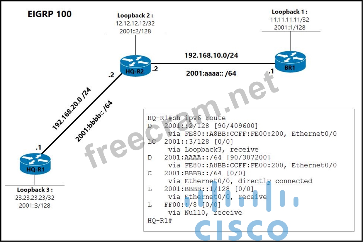Refer to the exhibit. All interfaces on each router are participating in the EIGRP 100 process. Which configuration ensures that the loopback IPv6 address of the branch router BR1 is advertised on the HQ-R1 routing table?