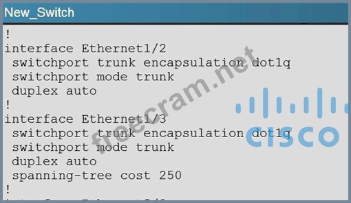 You have configured PVST+ load balancing between SW1 and the New_Switch in such a way that both the links E2/2 and E2/3 are utilized for traffic flow, which component of the configuration is preventing PVST+ load balancing between SW1 and SW2 links