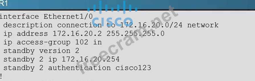 'Mar 26 11:17:53.089: HSRP: Et1/0 Grp2 Hello out 172.16.20.2 Active pri 100 vIP 172.16.20.254